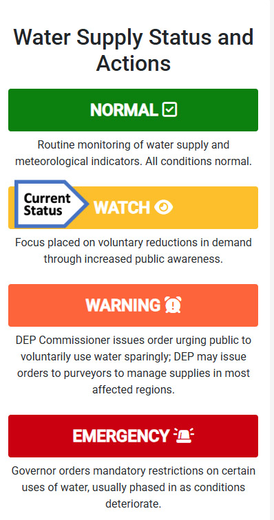 The DEP will continue to inform the public, local governments, and water systems of future actions to mitigate the risk of more severe conditions. Municipalities or water utilities may require additional restrictions depending upon local water supply conditions.