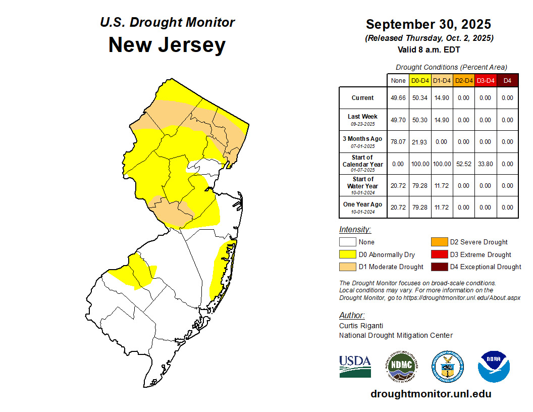 “Over the past year, New Jersey has experienced extreme weather variability that is consistent with a changing climate,” Environmental Protection Commissioner Shawn M. LaTourette said.“Last fall and winter were among the driest on record, leading to a Drought Warning in November that was followed by a very wet May and even severe flash flooding in parts of the state in July. But with the return of prolonged dry conditions over the latter part of this summer and early fall, water supplies are showing signs of stress again.”