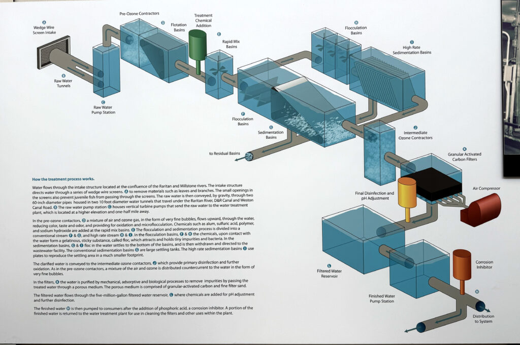 A graphic on the wall at the NJ American Water Canal Road plant explaining the water treatment process.