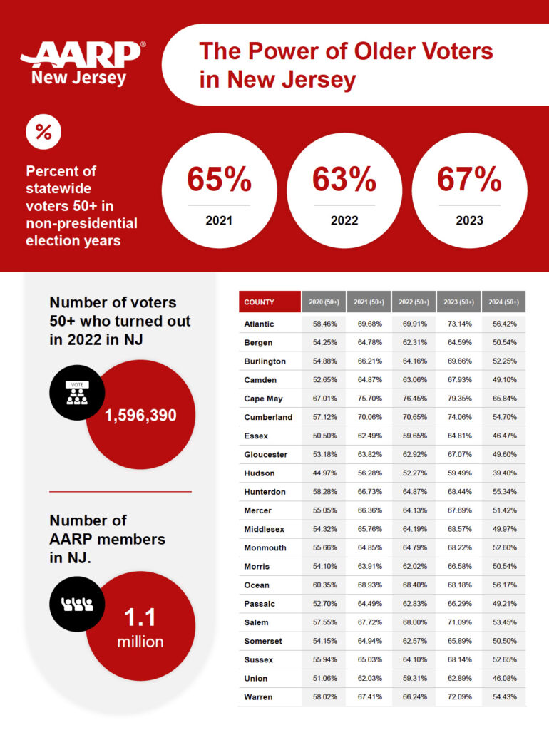 “AARP New Jersey is proud to highlight the critical role that older voters continue to play in our democracy,” Widelo said. “Their consistent and substantial turnout in elections, especially at the local and state levels, demonstrates their commitment to shaping the future of our communities.”