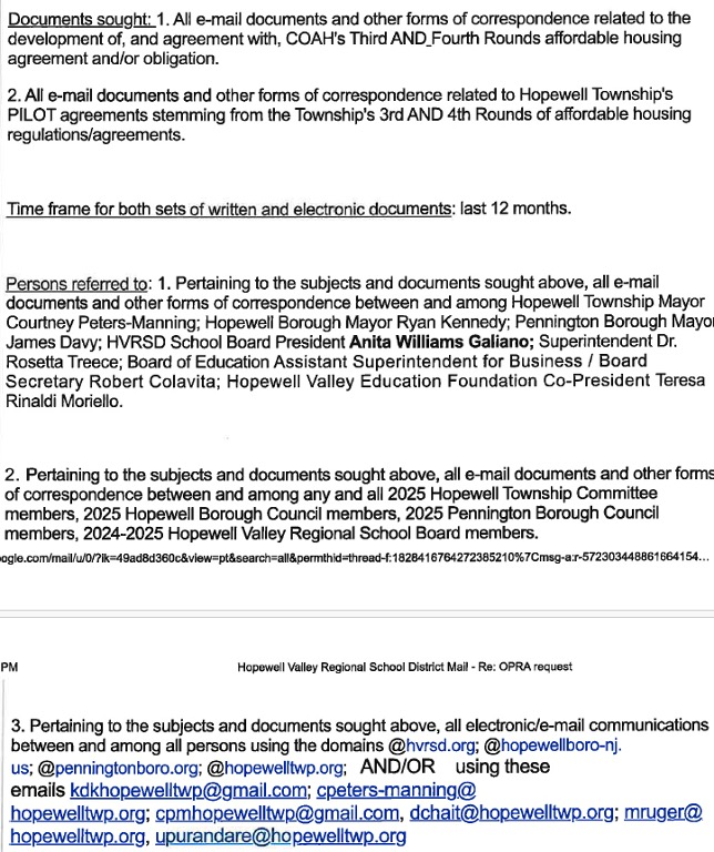Let’s start with the highlights, “please provide information without obfuscation or exaggeration,” the mayors write. In my opinion, the district been doing that. A detailed presentation listing out every project and proposed cost has been reviewed in every board meeting since… well for quite a few meeting cycles. A website providing further detail has been up on the Board portal https://sites.google.com/hvrsd.org/hvrsd-vote/home. In every meeting the Board and district administration field questions and suggestions during the public comment (alas, not from Ms. Sandom or Mr. Hart as I have not seen them at any of our recent meetings). Furthermore, Ms. Sandom has taken full advantage of the Open Public Records Act (OPRA) to request – and obtain – significant information. Just for completion, let me present the full list of OPRA requests she has made within the last year (obtained via my own OPRA request):