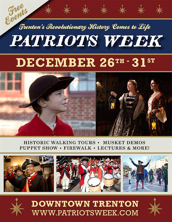 Trenton’s annual Patriots Week returns December 26–31, celebrating New Jersey’s Revolutionary War history with tours, reenactments, children’s workshops, lectures, performances, and special exhibits. All events below are open to the public; most are free unless otherwise noted. Find additional details at patriotsweek.com