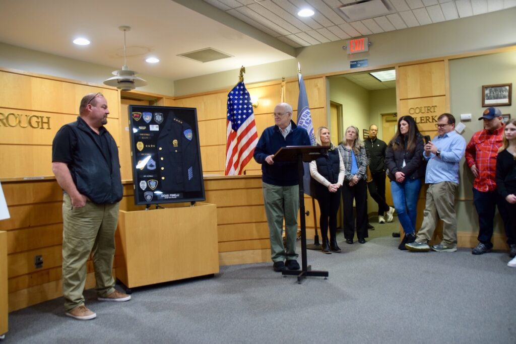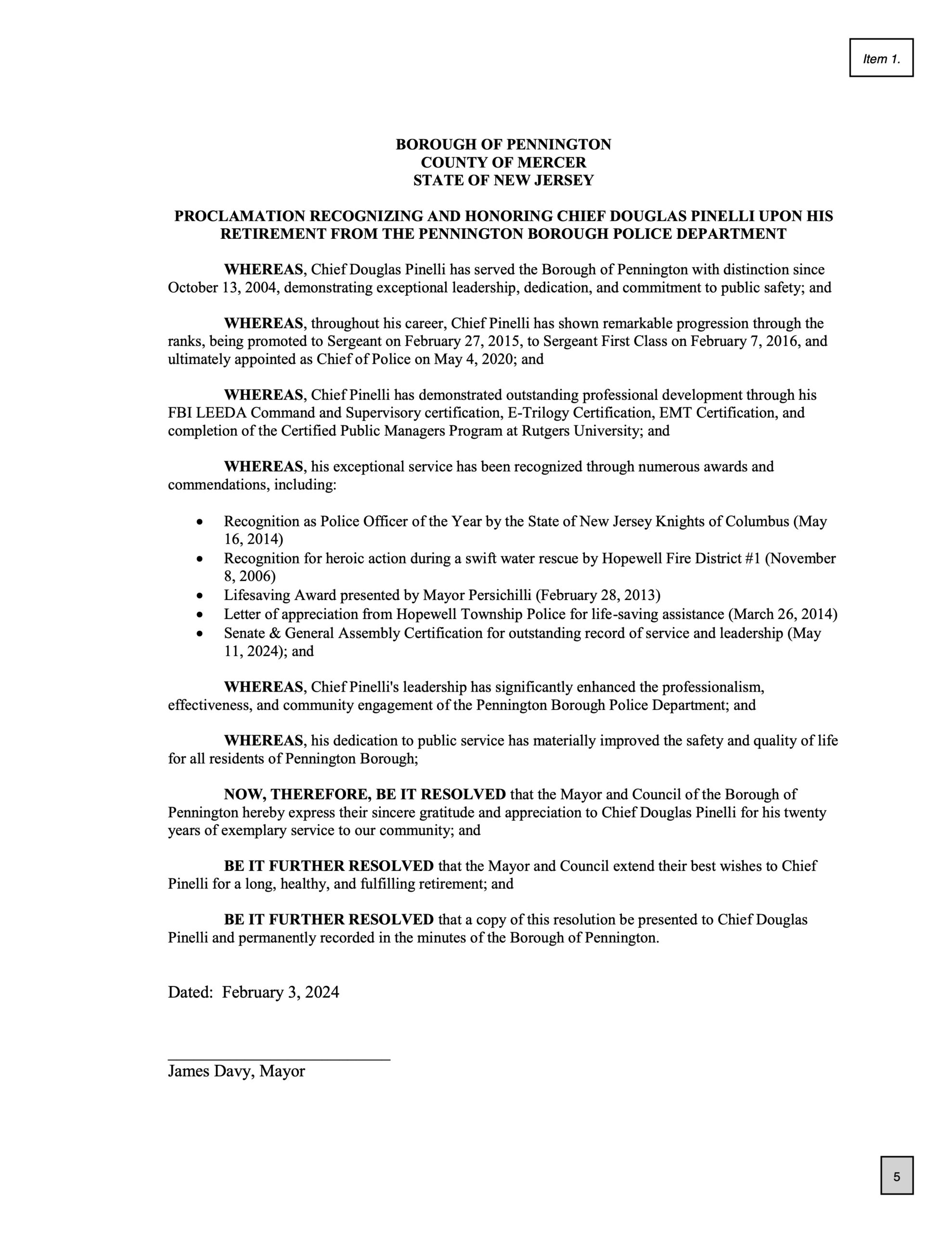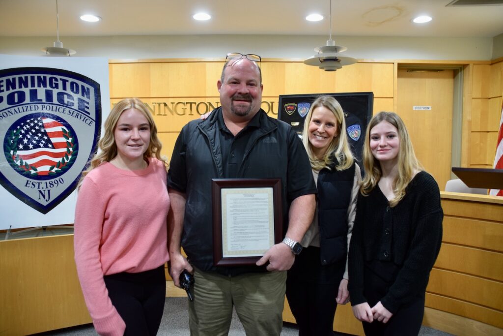 January 31 marked the last day on the job for Chief of Police Douglas Pinelli of the Pennington Police Department. Chief Pinelli, who has served in the Police Department for more than 20 years, was awarded a proclamation by Pennington Mayor Jim Davy. In emotional speeches, the Chief’s wife and daughter spoke proudly of the Chief’s many accomplishments during his tenure with the Department.