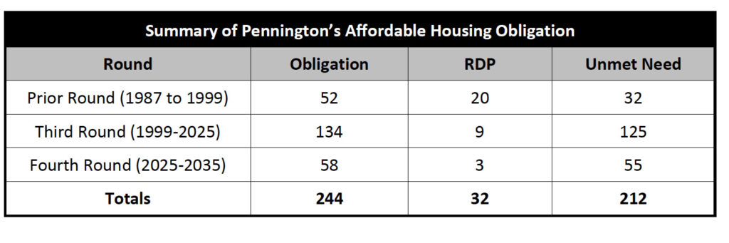 New Jersey municipalities were required to submit draft affordable housing plans by June 2025 and must finalize supporting ordinances by March 15, 2026. Pennington’s Fourth Round obligation is 58 affordable units, but because the borough must also address earlier obligations, its total “unmet need” rises above 150 units.