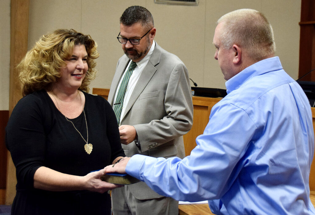 Board Chairman Erik Burd administered the oath of office while Swanson’s wife, Jamie, held the family Bible.