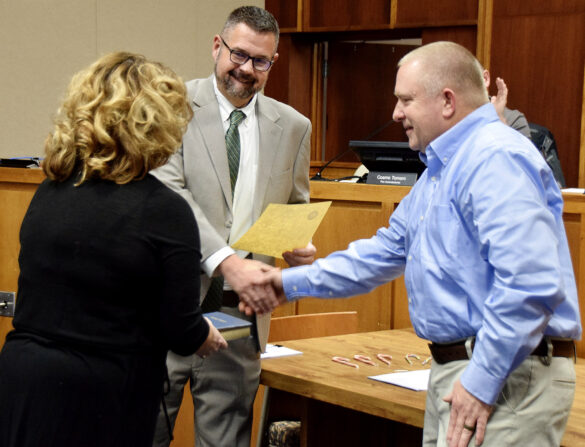 Board Chairman Erik Burd administered the oath of office while Swanson’s wife, Jamie, held the family Bible.