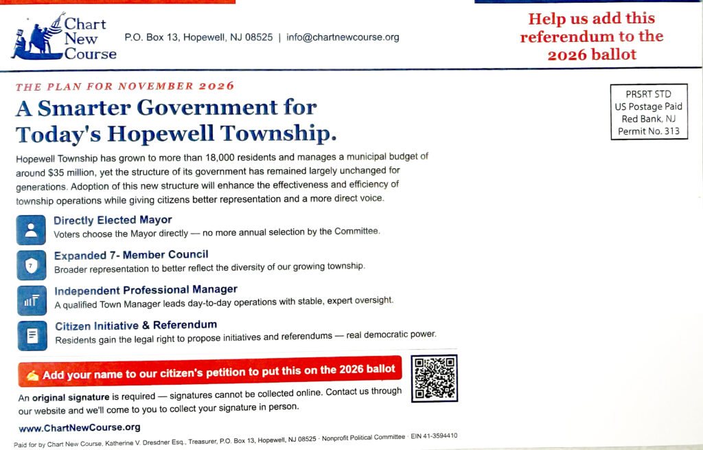 We’re coming together across the political spectrum to update and strengthen Hopewell Township’s government for the challenges ahead. Together, we are proposing a new form of local government: one with a directly elected mayor and an expanded council to better reflect and represent our Township’s diverse communities.