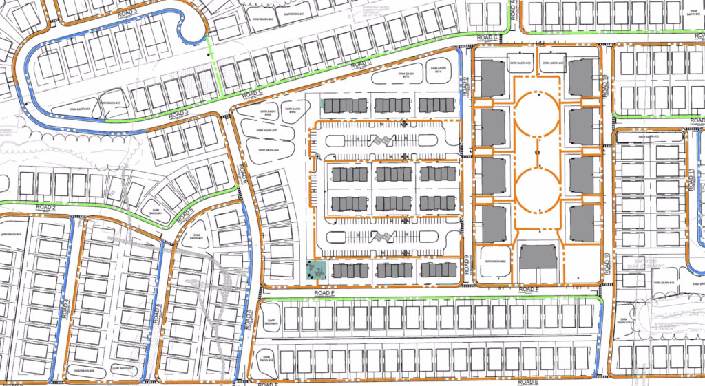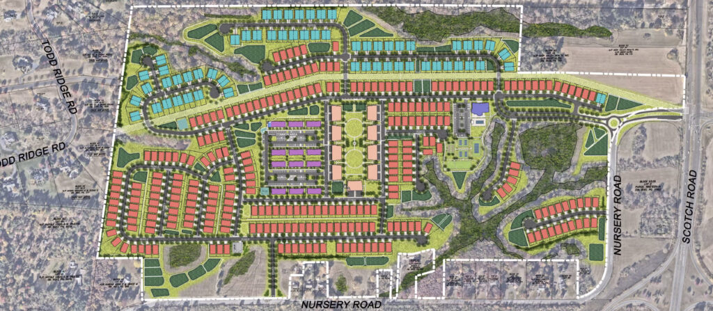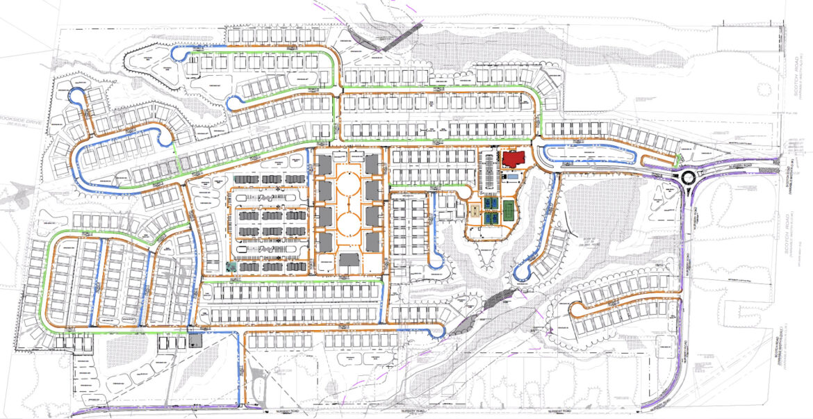 A rendering of the proposed “The Venue” development off Nursery Rd. and Scotch Rd. Above the same development showing proposed sidewalks. Orange and purple indicate sidewalks and some walkways will be added or removed based on discussion with the planning board.