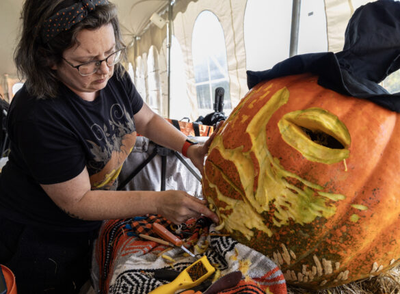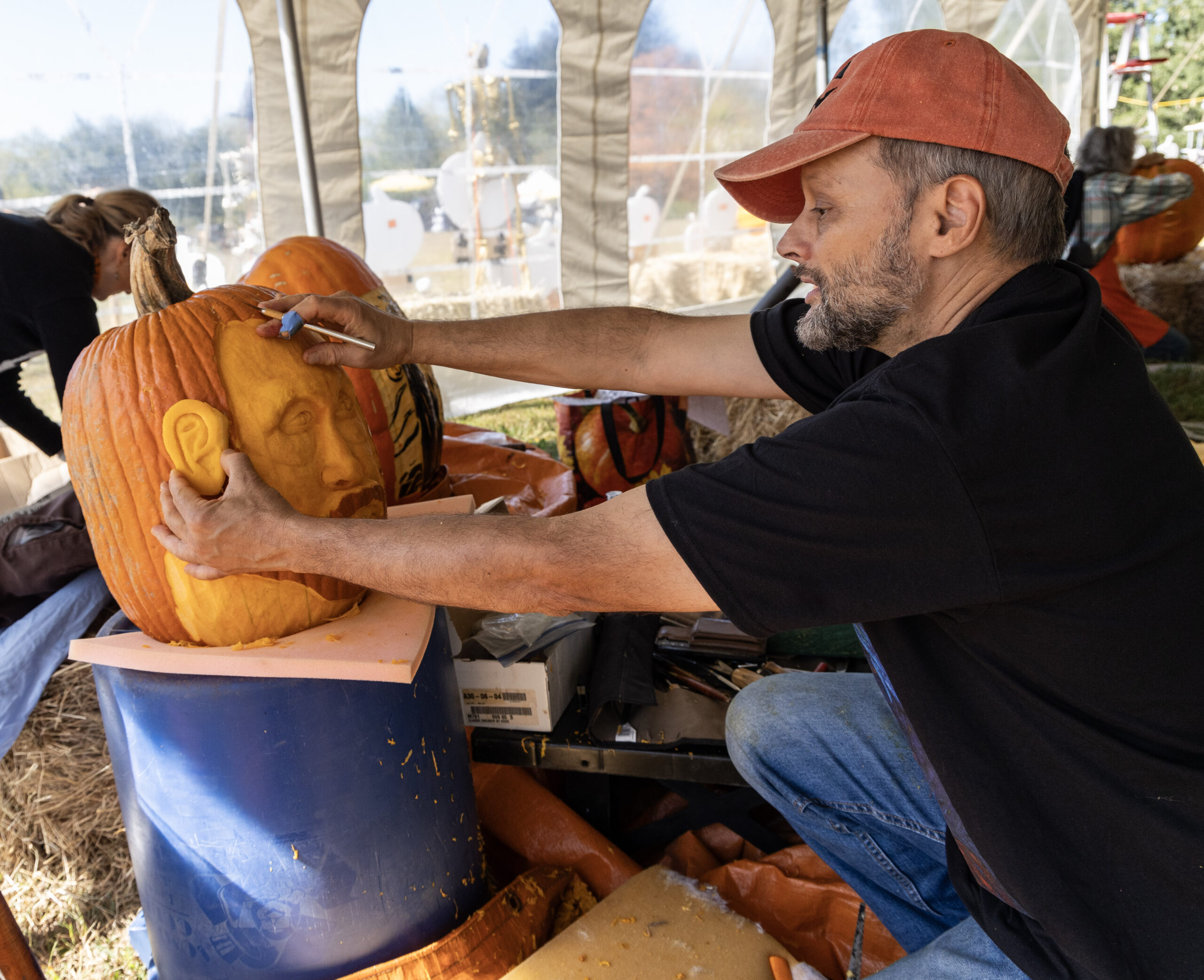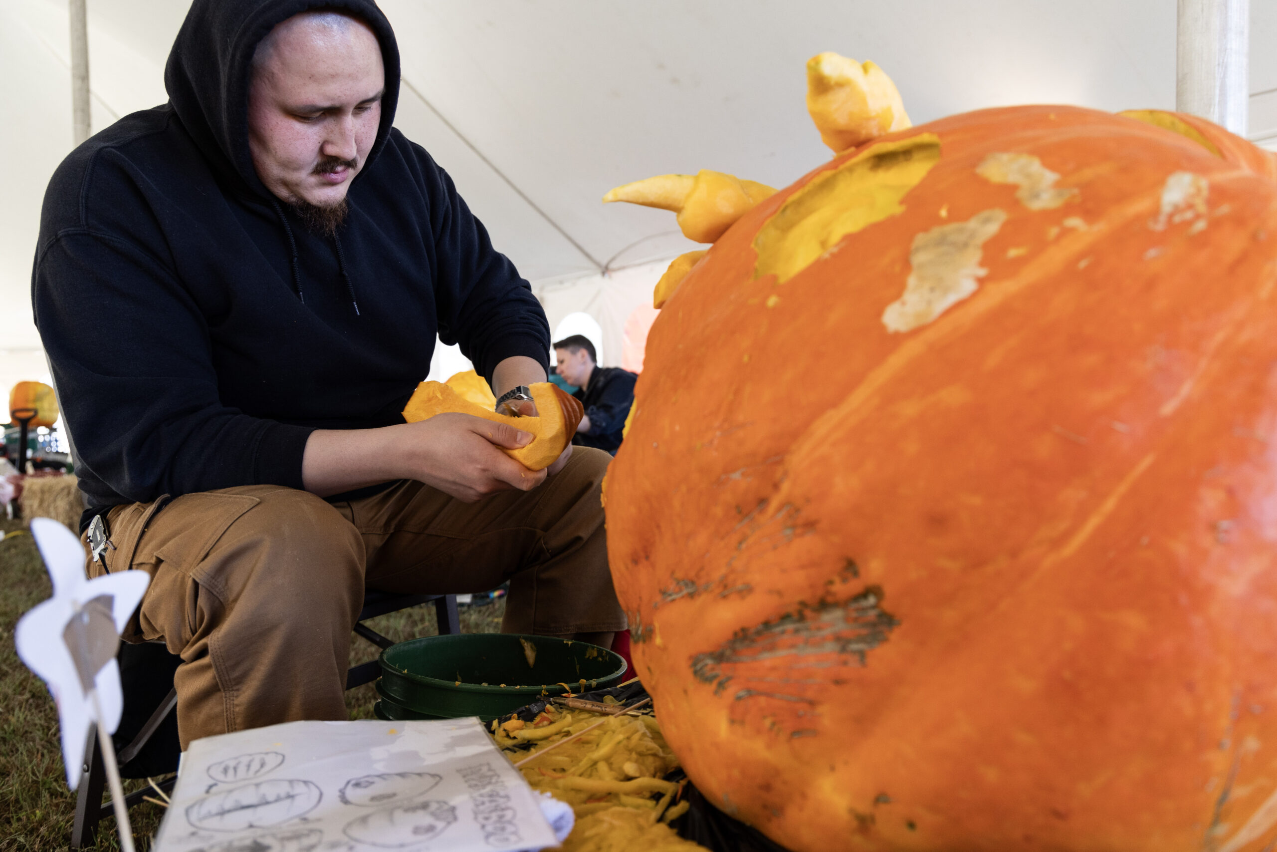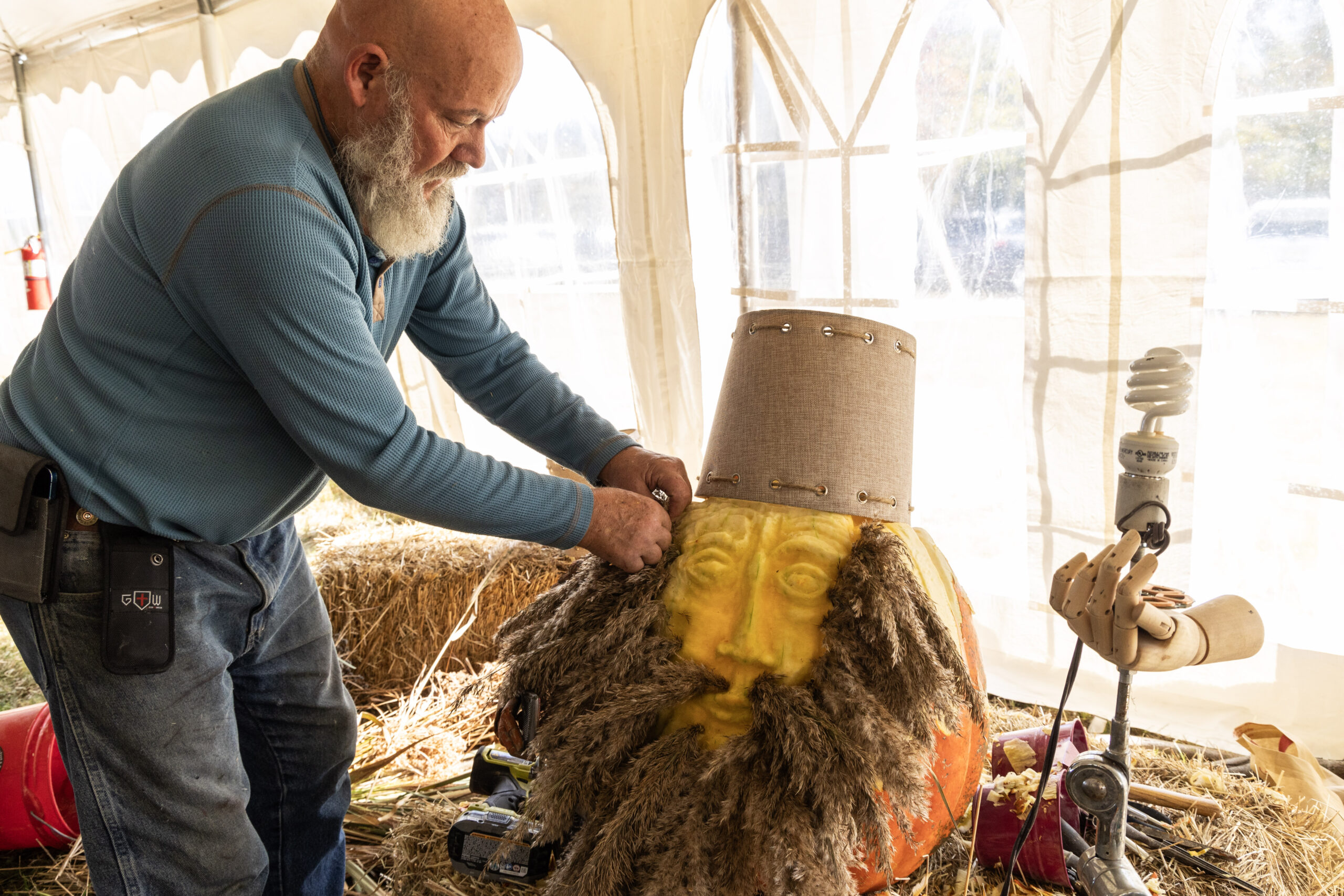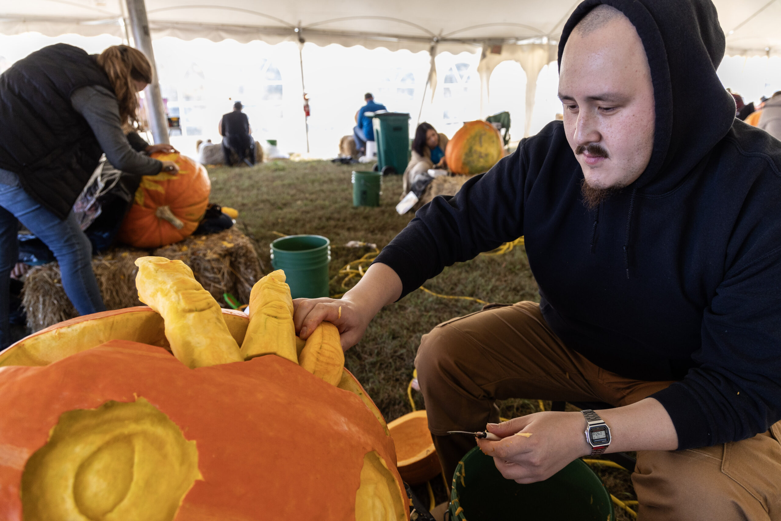 All of the pumpkins were carved on Thursday. Carvers arrived in the morning and worked throughout the day on their creations ranging from lighthearted to haunting. Many are returning carvers who participate annually, while others are new to the event, joining students, families, and professional artists in creating the displays.