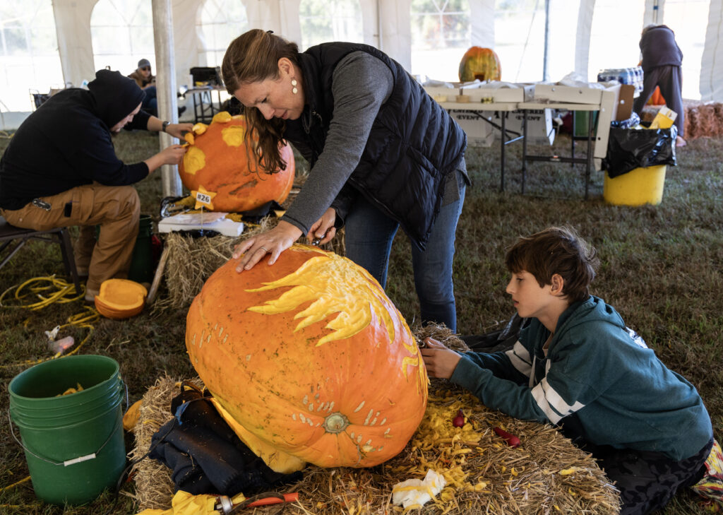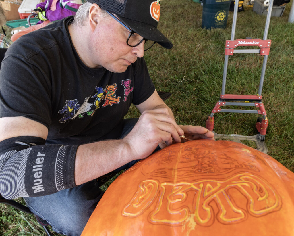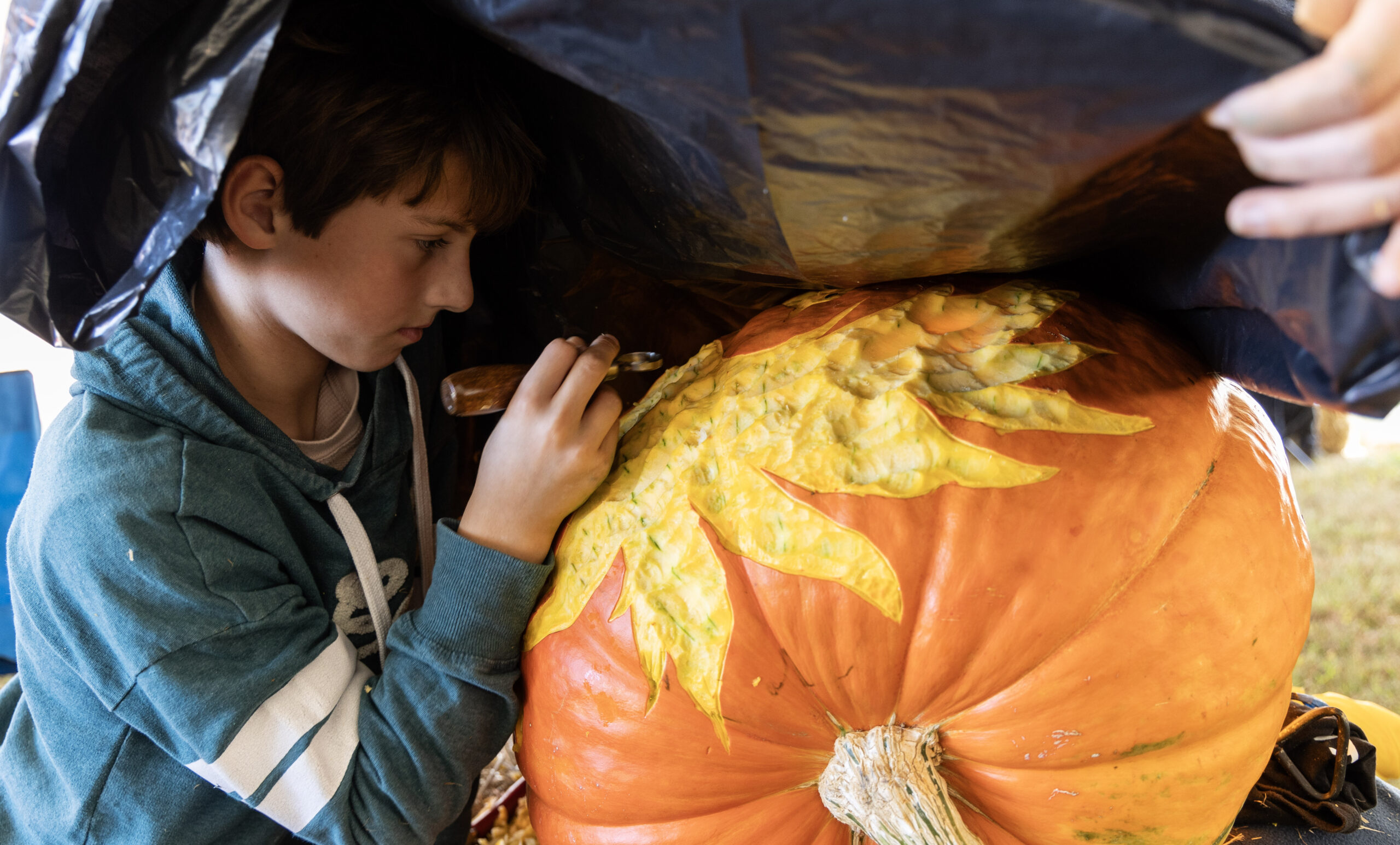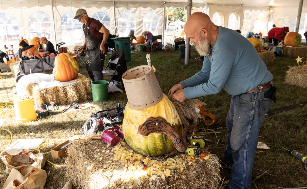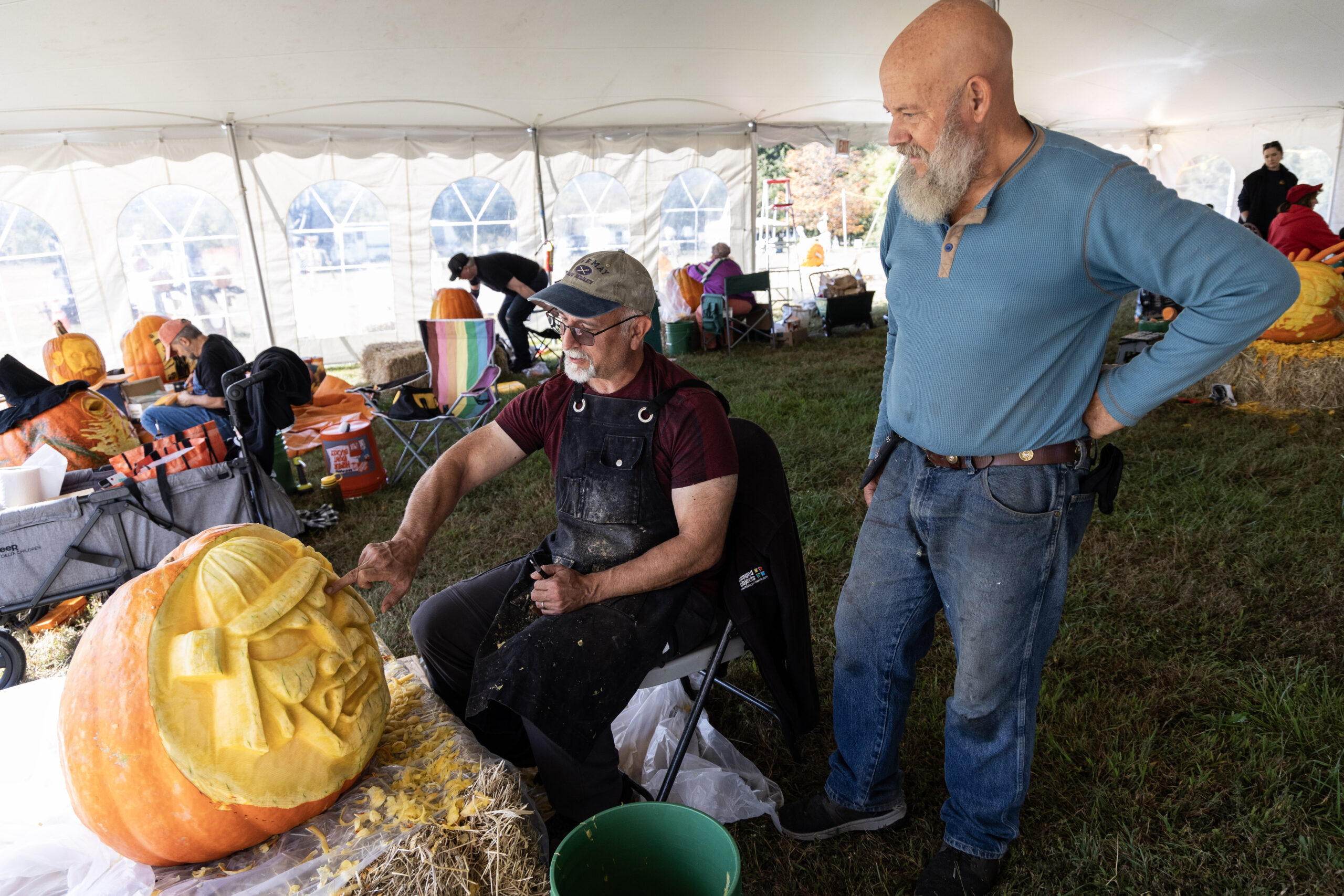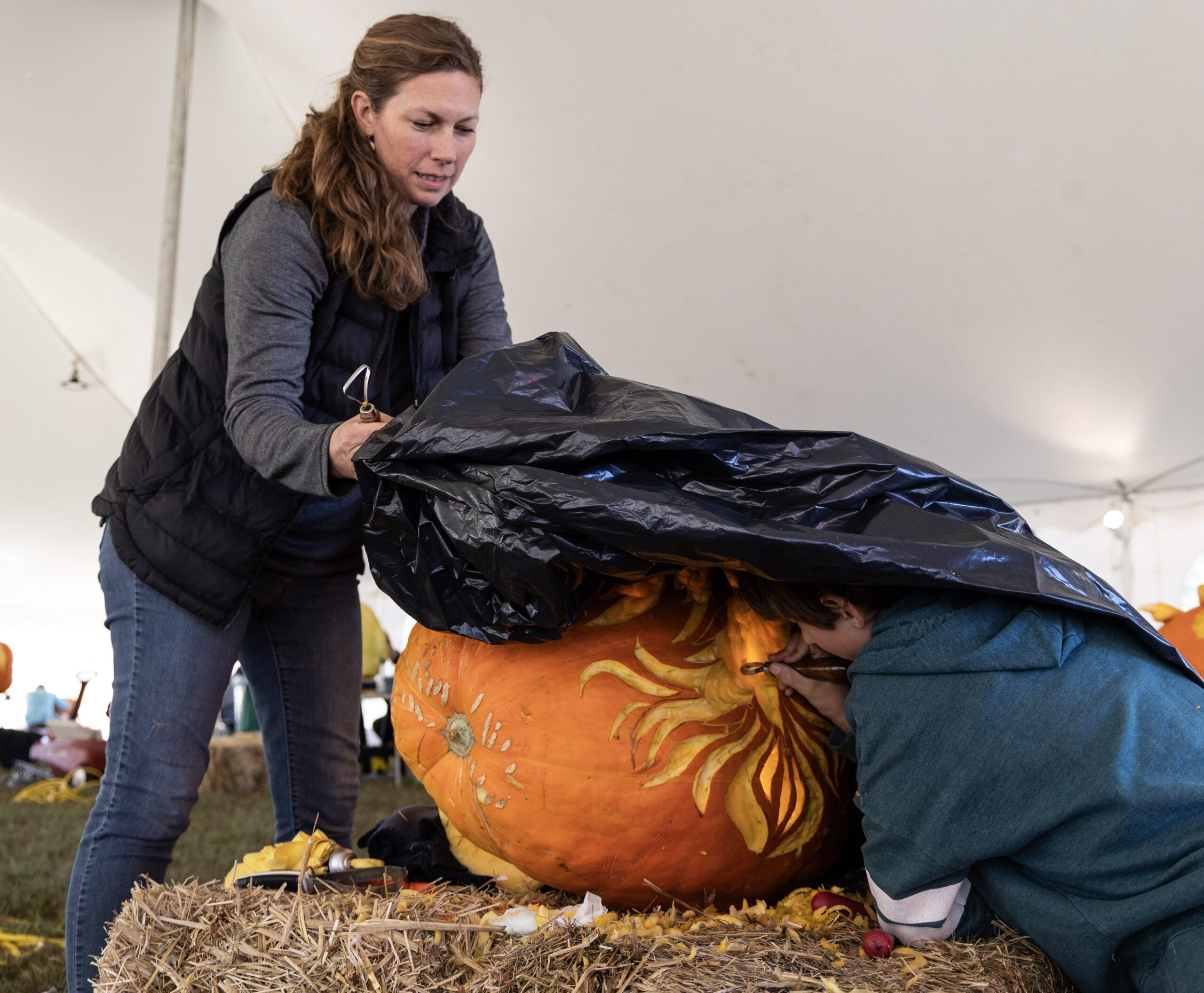 All of the pumpkins were carved on Thursday. Carvers arrived in the morning and worked throughout the day on their creations ranging from lighthearted to haunting. Many are returning carvers who participate annually, while others are new to the event, joining students, families, and professional artists in creating the displays.