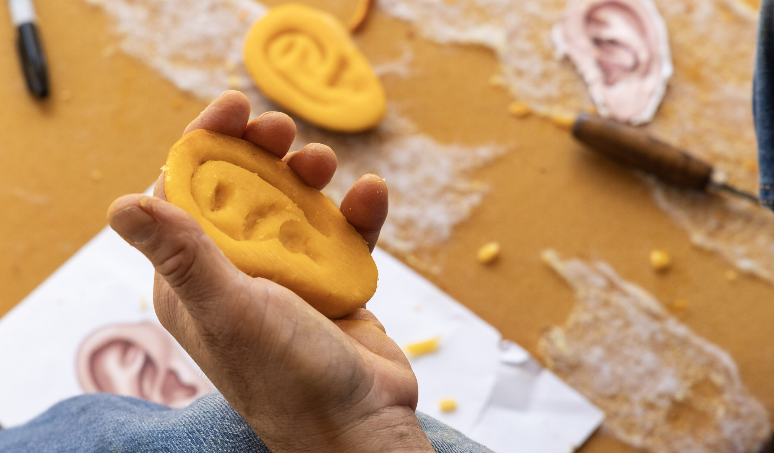 Local artist and first-time carver Bodhi Williams was finding ways to incorporate his own art, which often uses found and recovered objects, into his “Leonardo da Pumpkin” carve. “I found some lamps on my way here that I’m using to light the pumpkin,” he said. “And the lamp shade will be the hat.”