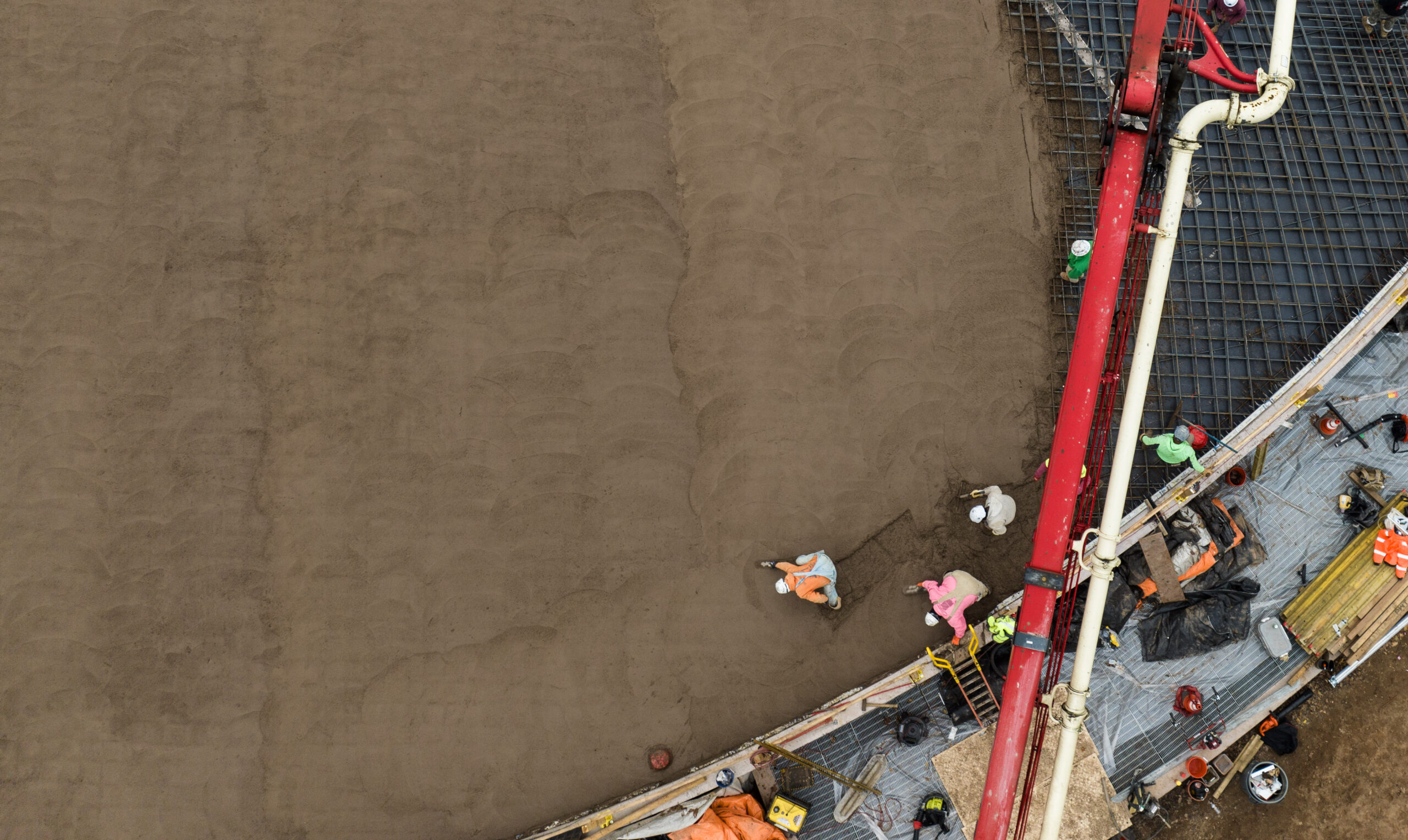 The massive single pour — nearly 250 cubic yards of concrete — was shaped across a sloped and cambered deck that follows the arc of the museum’s curved exterior wall. Crews from multiple trades worked in continuous coordination to complete the placement, which Kamaratos described as the moment the museum “truly takes its final form” ahead of its planned opening in Spring 2026.