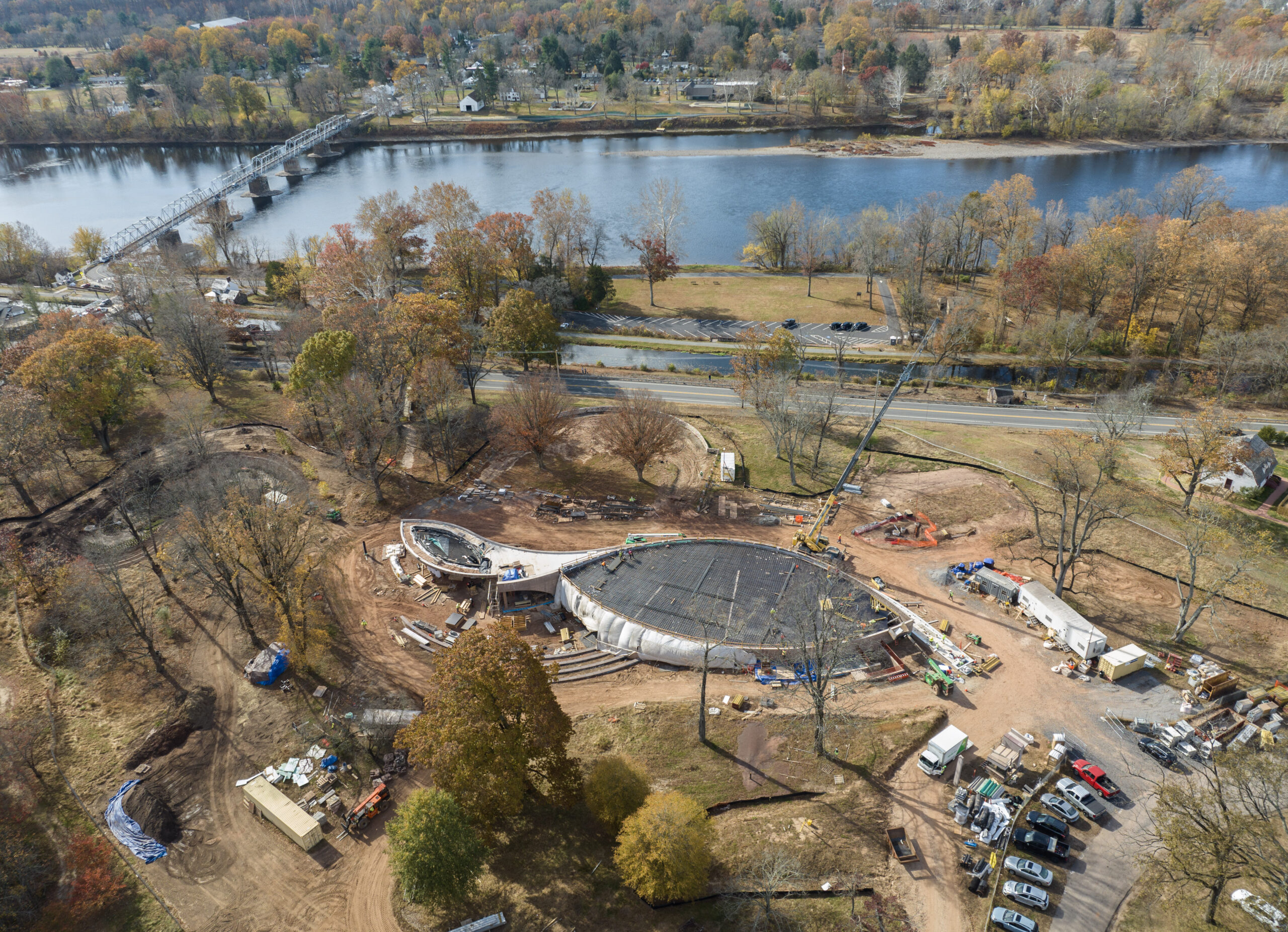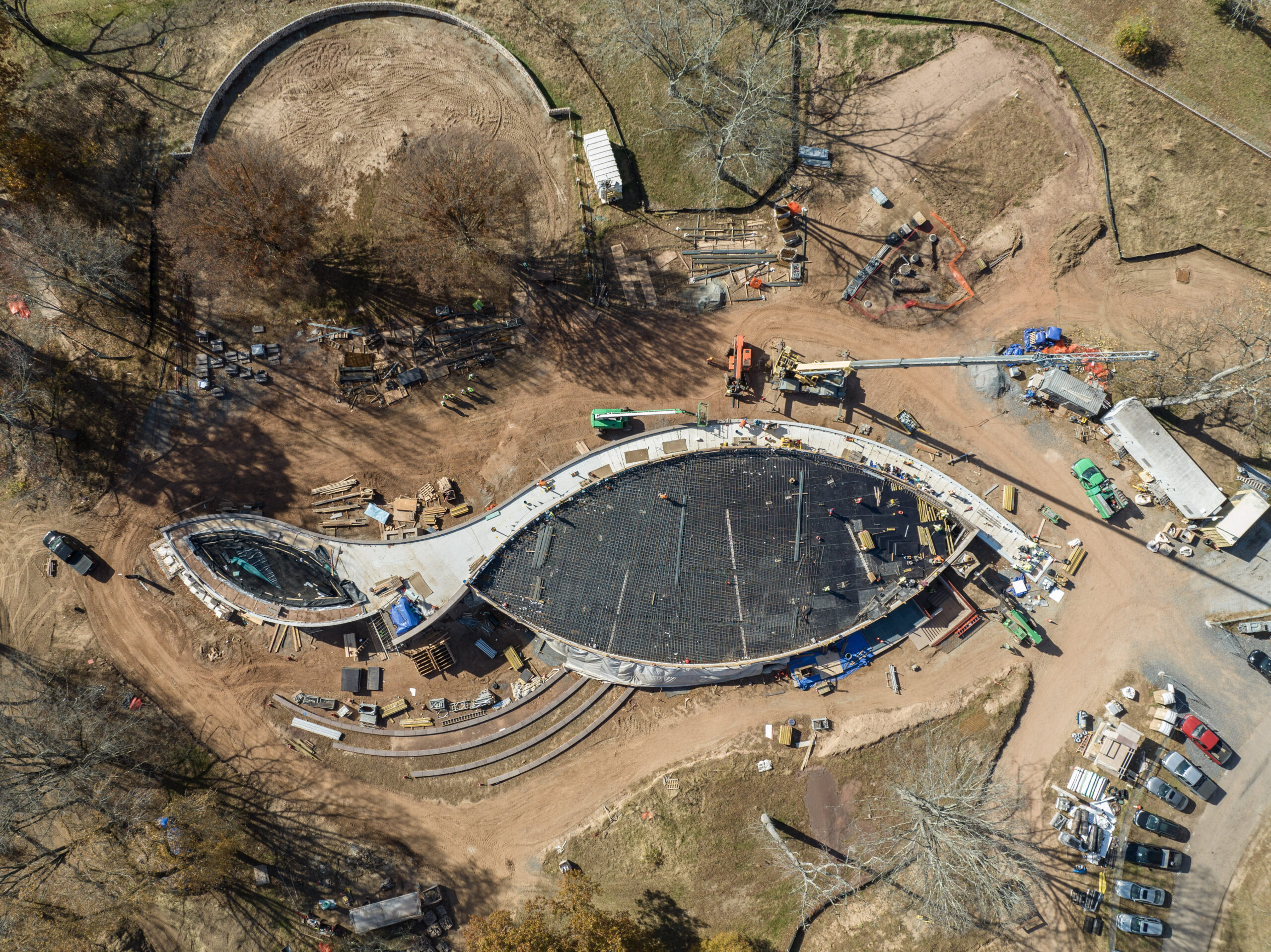 With the roof installed, construction will shift toward finishing the museum’s exterior and beginning detailed interior work.