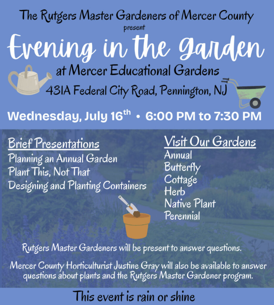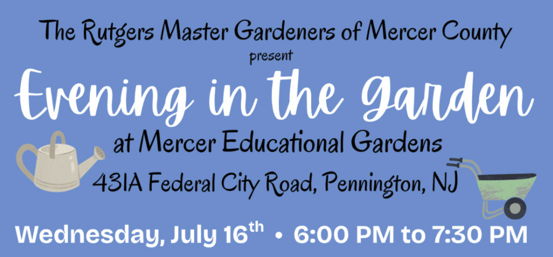 The Rutgers Master Gardeners of Mercer County invite the public to attend “Evening in the Garden” on Wednesday, July 16, from 6:00 to 7:30 PM at Mercer Educational Gardens, located at 431A Federal City Road in Pennington.