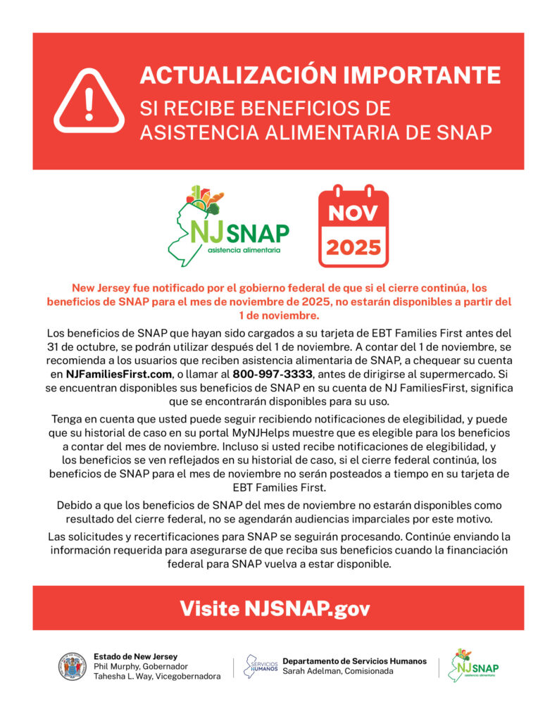 On October 21, the New Jersey Department of Human Services announced that if the shutdown continues, November SNAP benefits “will not be available on November 1.” Any benefits already loaded on Families First EBT cards before October 31 will remain usable, but no new benefits will post until federal funding resumes.