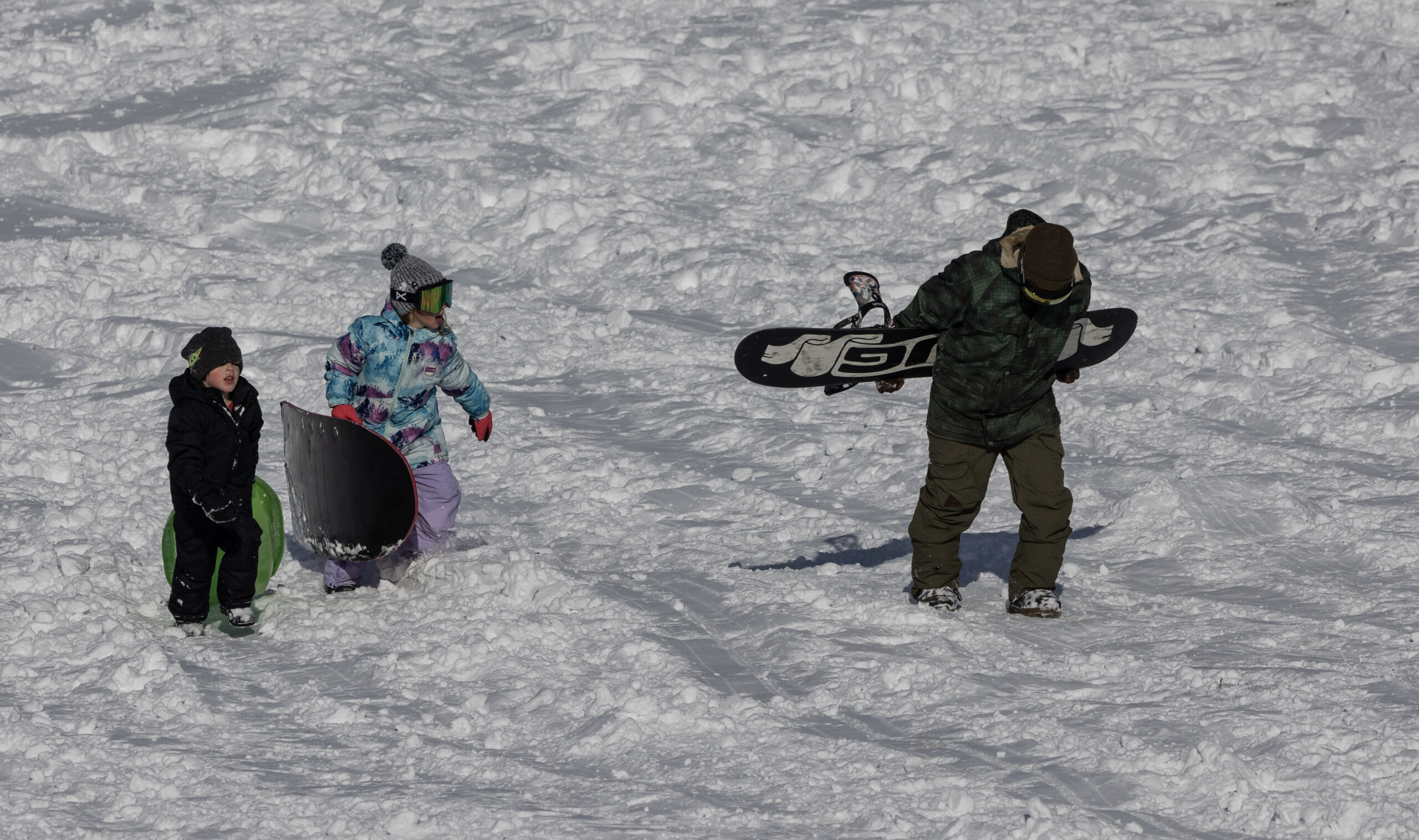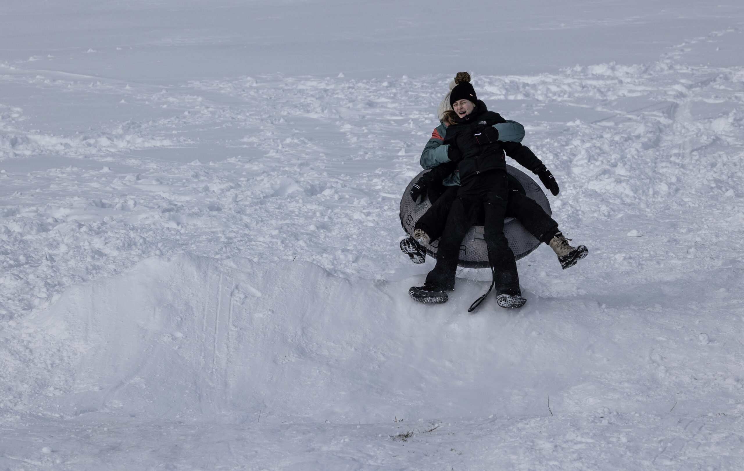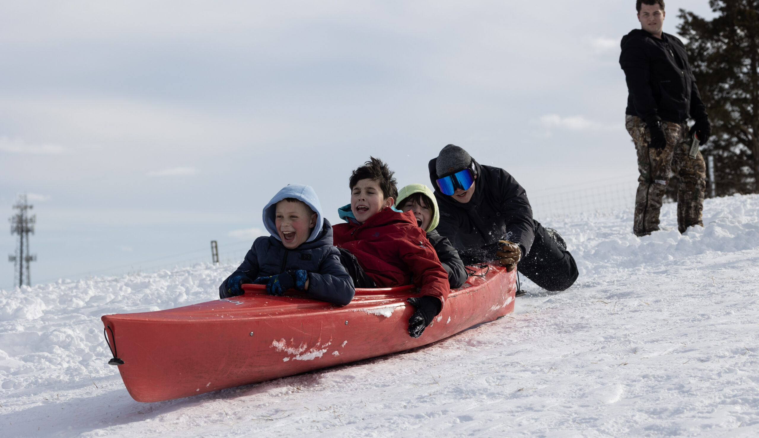 Bright sleds streaked down packed lanes carved into the slope while others trudged uphill pulling tubes and plastic toboggans. A few riders experimented with unconventional craft — including a red kayak steered downhill with a paddle — to the delight of onlookers gathered along the crest.