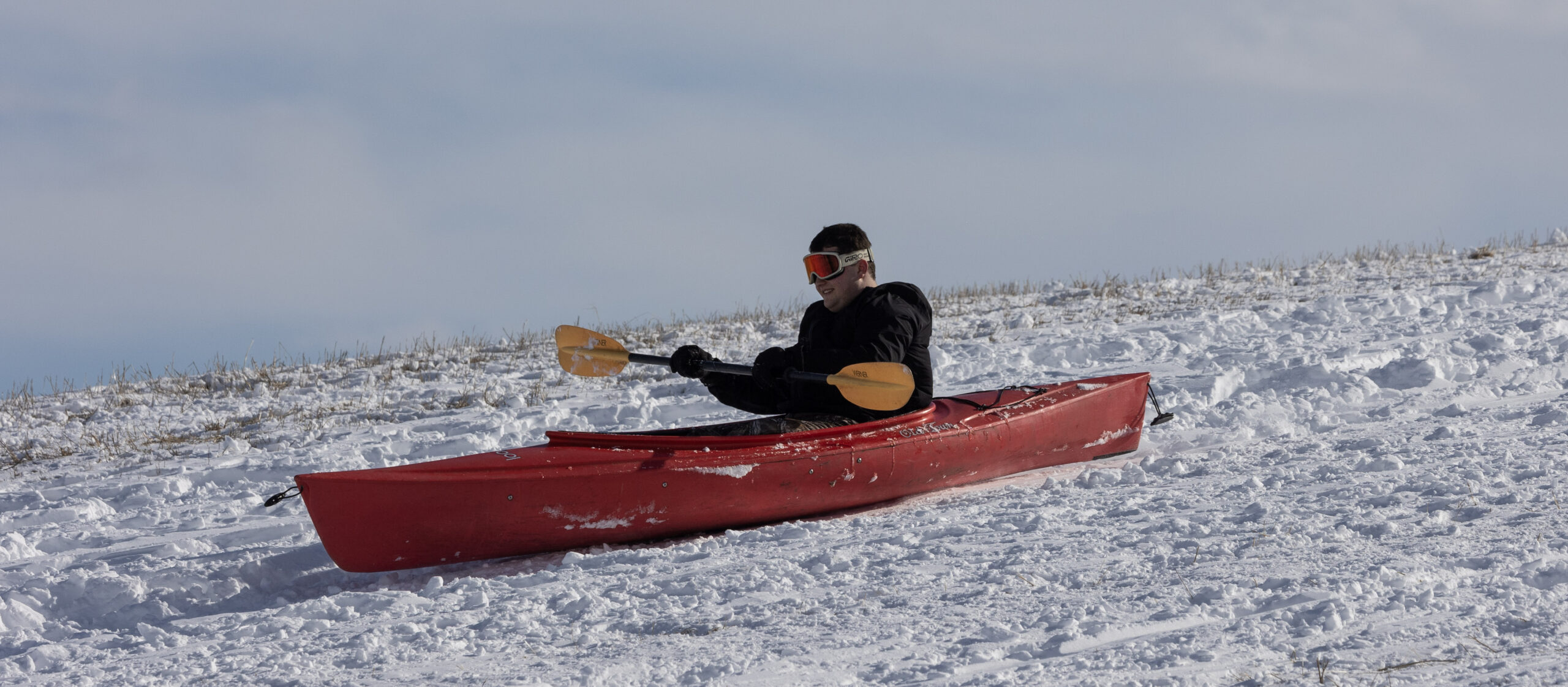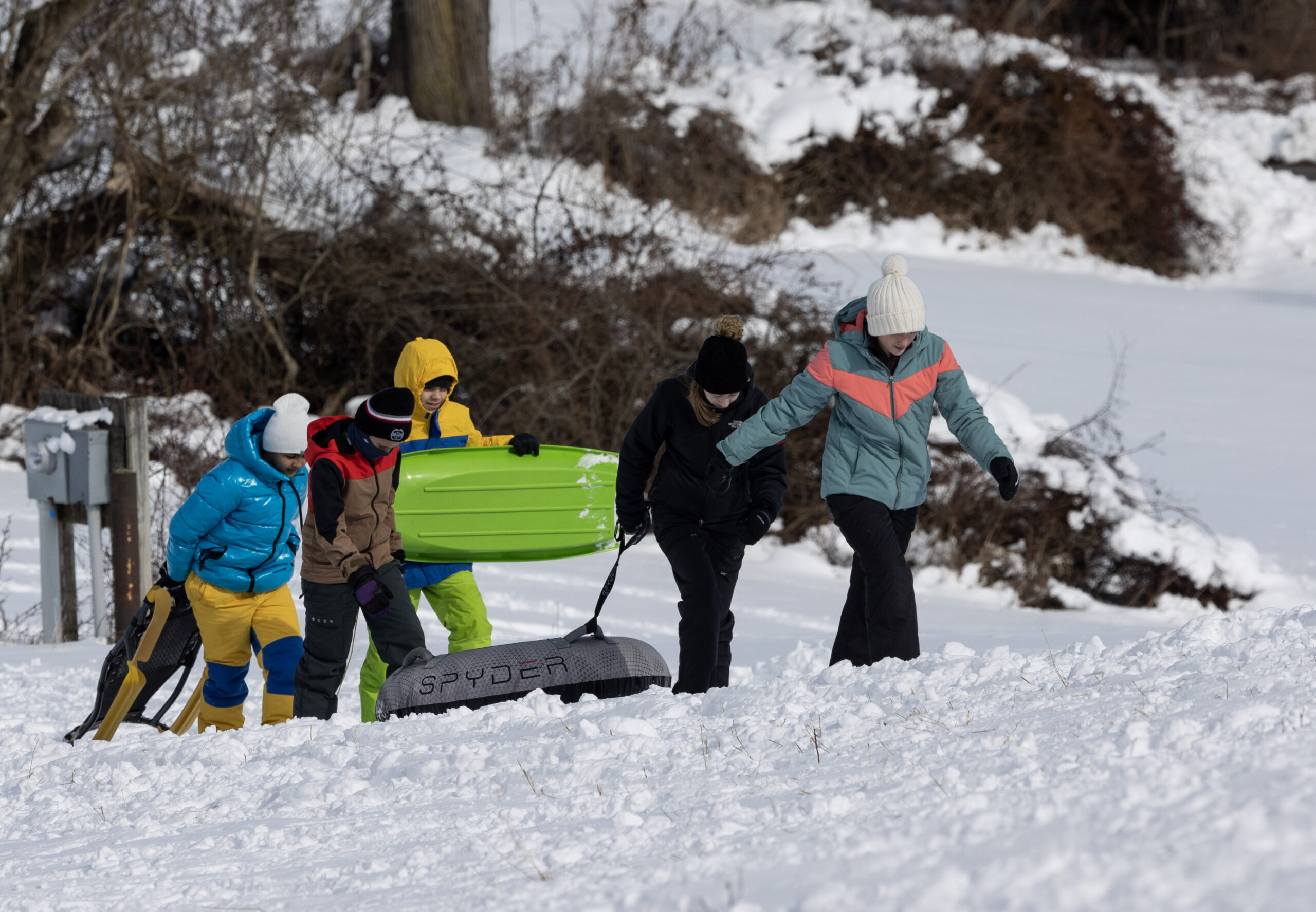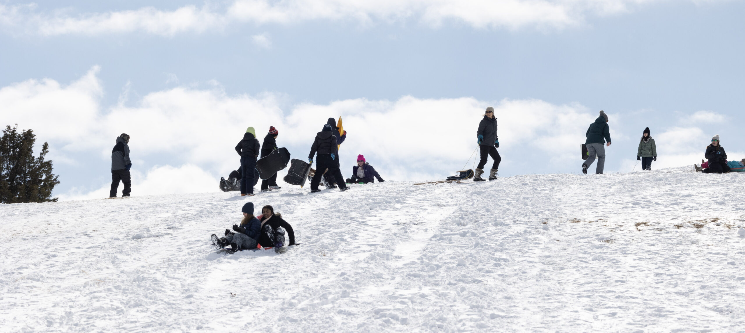 Bright sleds streaked down packed lanes carved into the slope while others trudged uphill pulling tubes and plastic toboggans. A few riders experimented with unconventional craft — including a red kayak steered downhill with a paddle — to the delight of onlookers gathered along the crest.