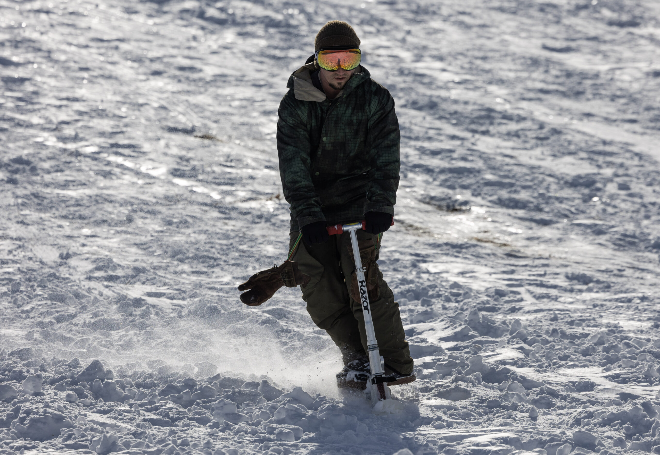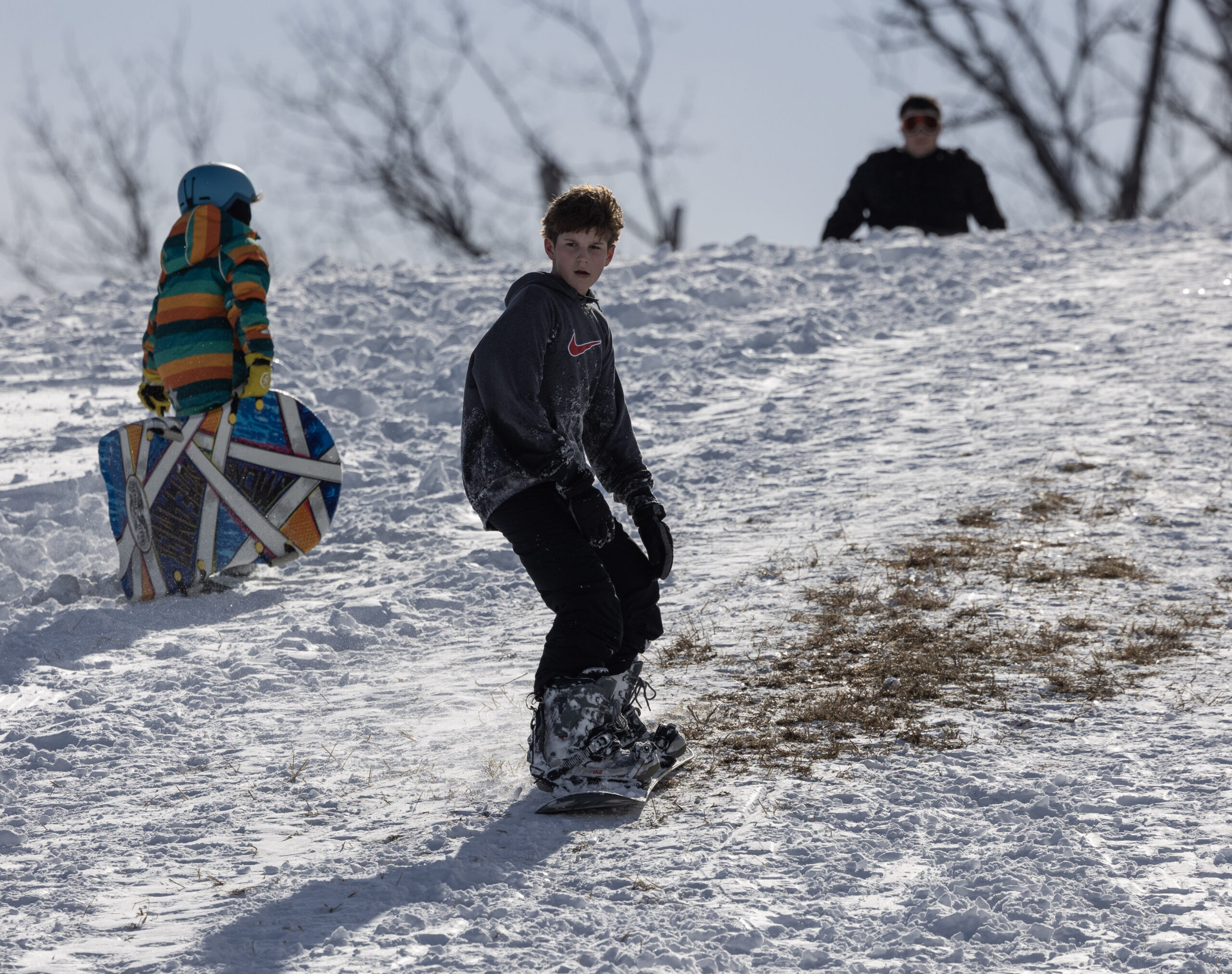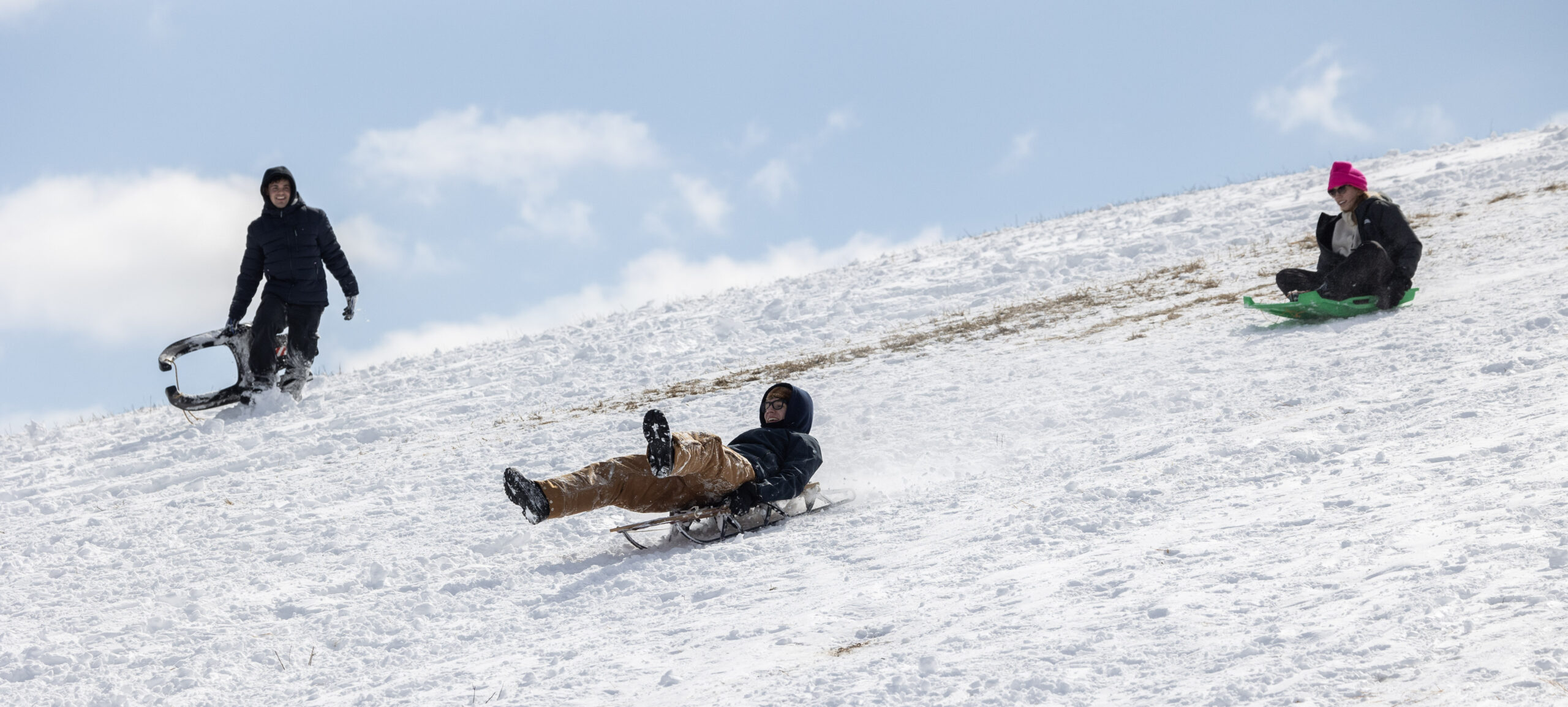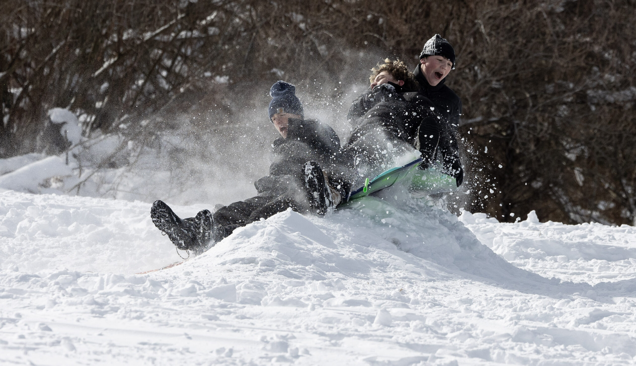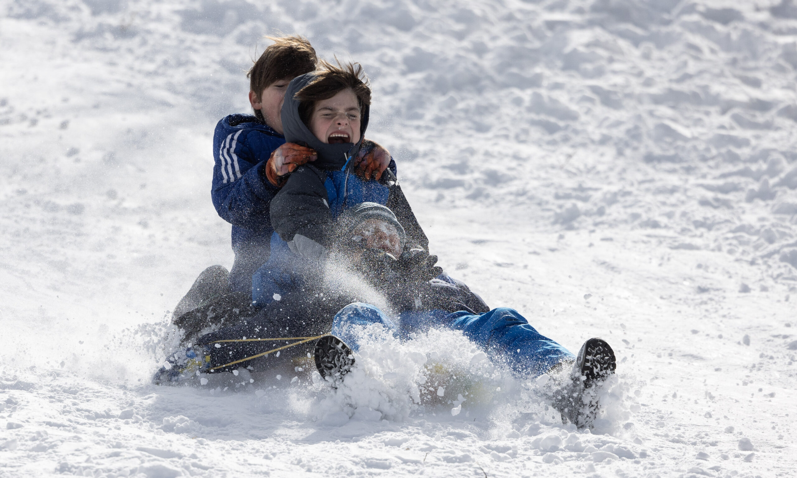 While the heaviest snow ended Monday, gusty winds continued into Tuesday, helping preserve Belle Mountain’s well-packed sledding runs.