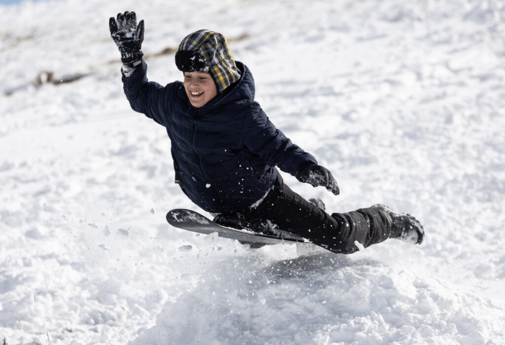 Children launched themselves over snow mounds, parents filmed runs on phones, and clusters of neighbors lingered at the top chatting in the cold sunshine.