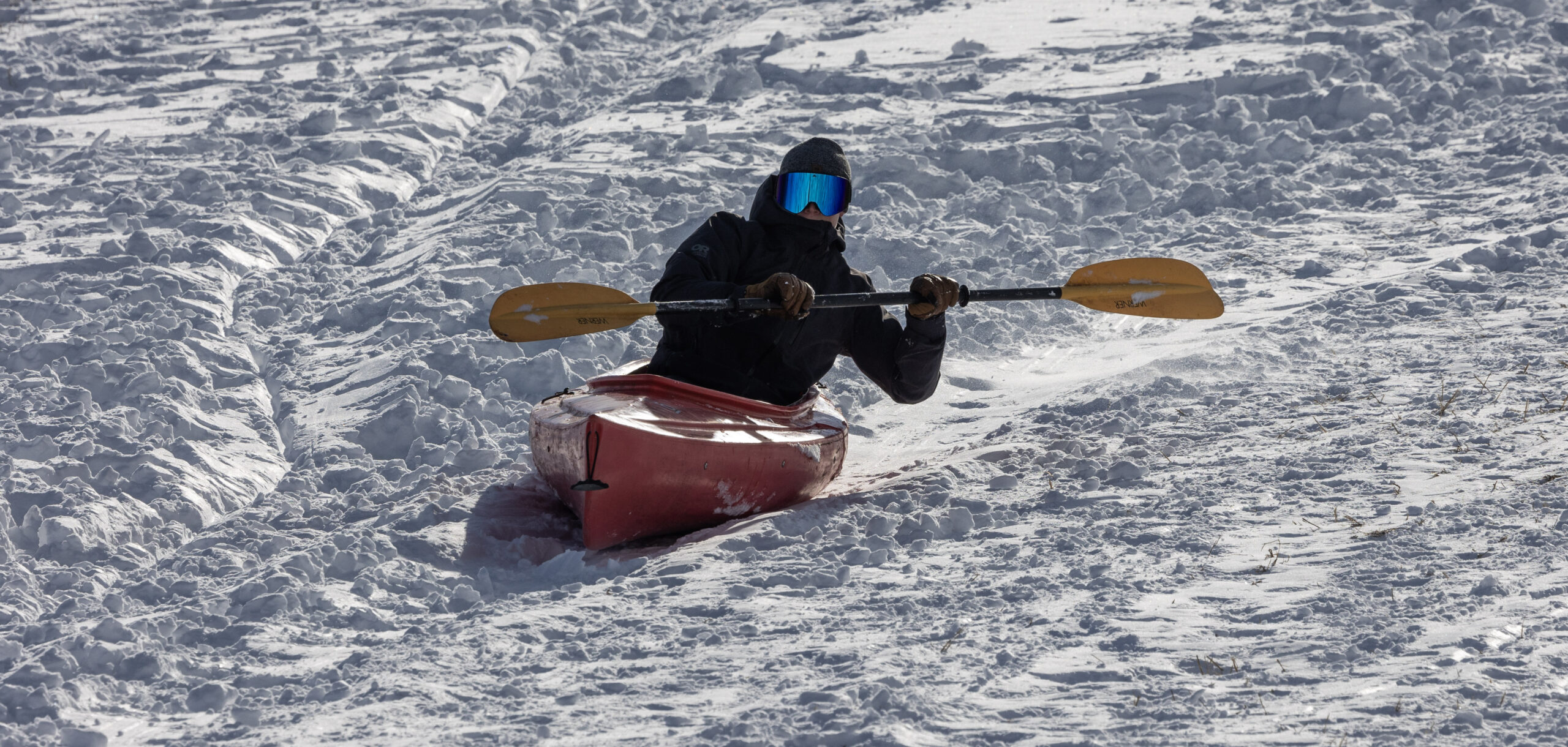 Bright sleds streaked down packed lanes carved into the slope while others trudged uphill pulling tubes and plastic toboggans. A few riders experimented with unconventional craft — including a red kayak steered downhill with a paddle — to the delight of onlookers gathered along the crest.