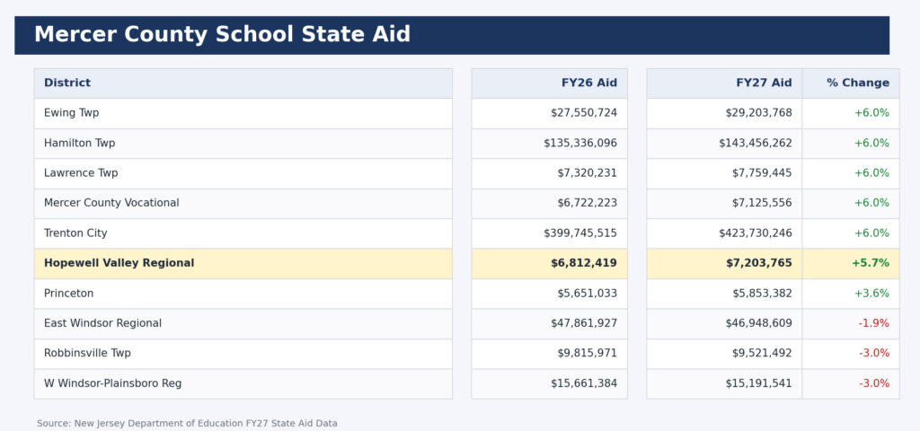 According to newly released state funding figures for the 2026–27 school year, Hopewell Valley is slated to receive about $7.2 million in total state aid, up from roughly $6.8 million this year. The increase of approximately $391,000, or about 5.7 percent, places the district among those in Mercer County seeing additional support rather than reductions.