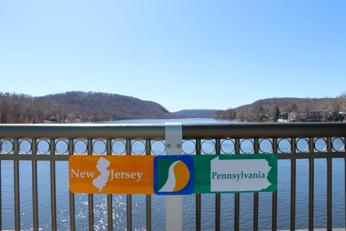 Designed and installed by the Delaware River Joint Toll Bridge Commission (DRJTBC), the new setup includes three metal signs — one for each state and one with the DRJTBC logo — mounted on the bridge’s railing. Two railing sections and a support post are also painted in distinct colors to mark the spot where the states meet.