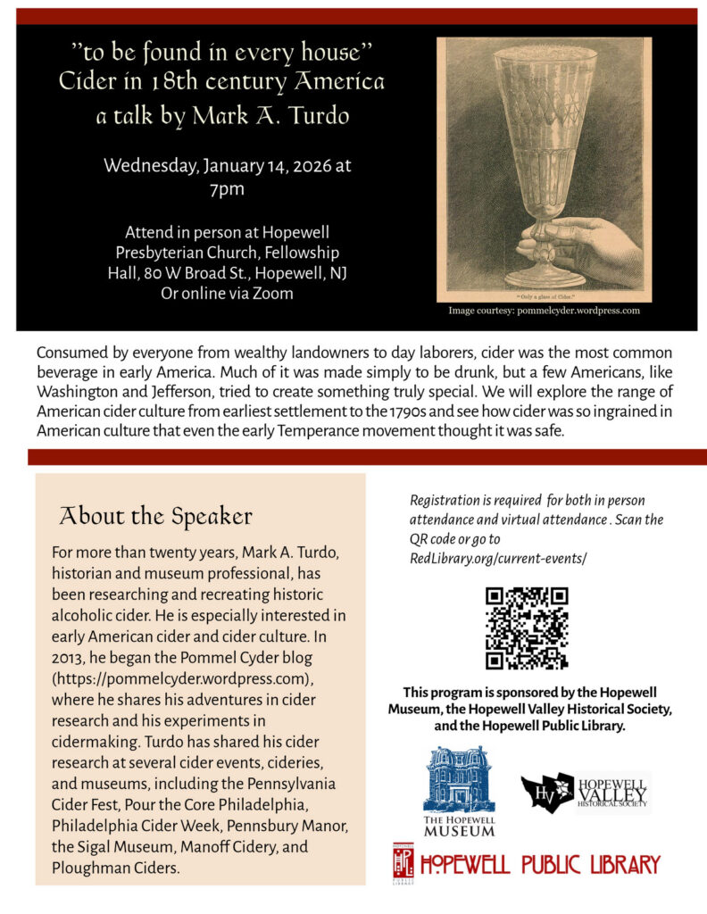 The Hopewell Museum, Hopewell Valley Historical Society, and Hopewell Public Library will host a talk on the history of cider in early America on Wednesday, January 14, 2026, at 7 p.m.