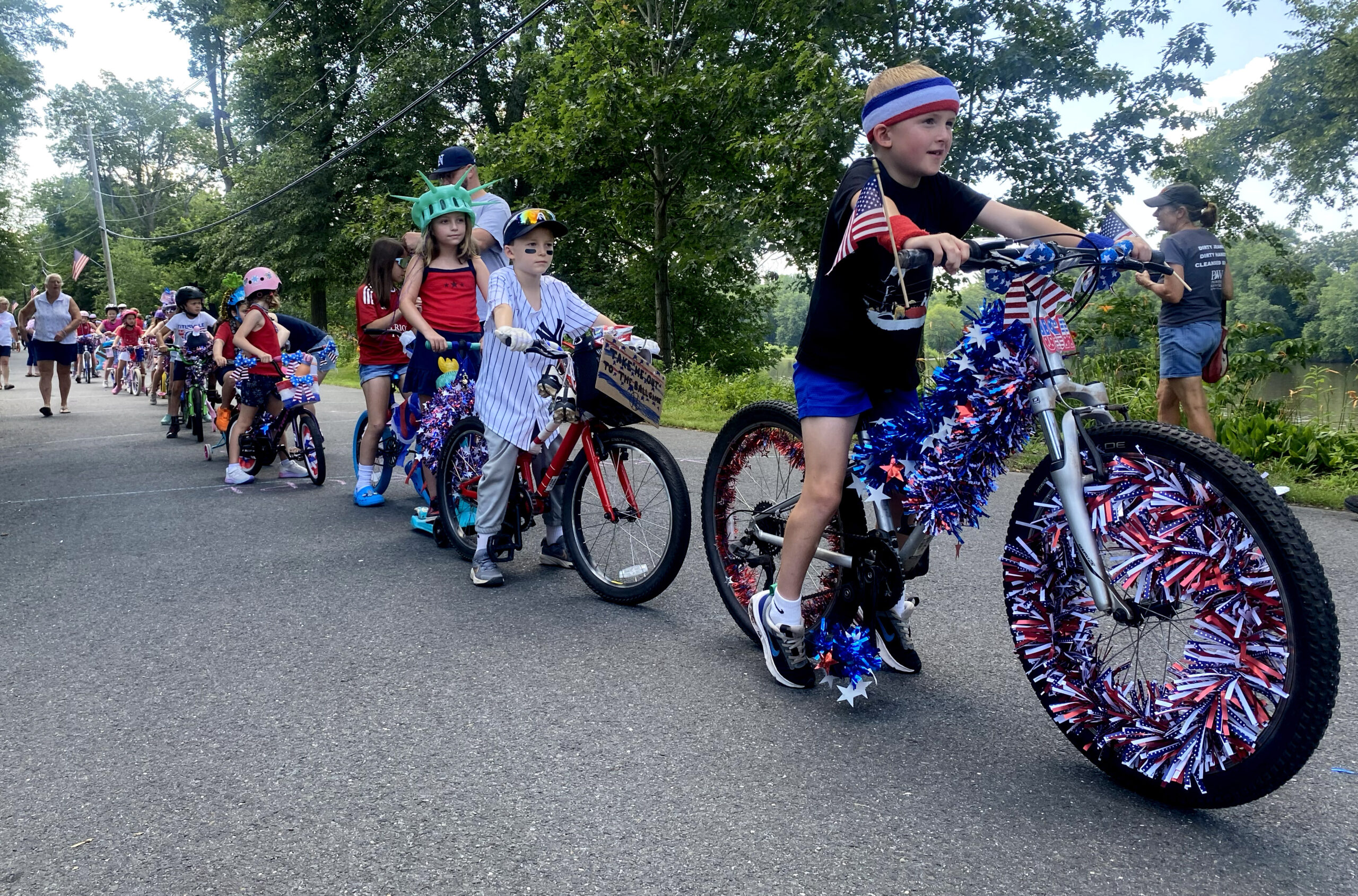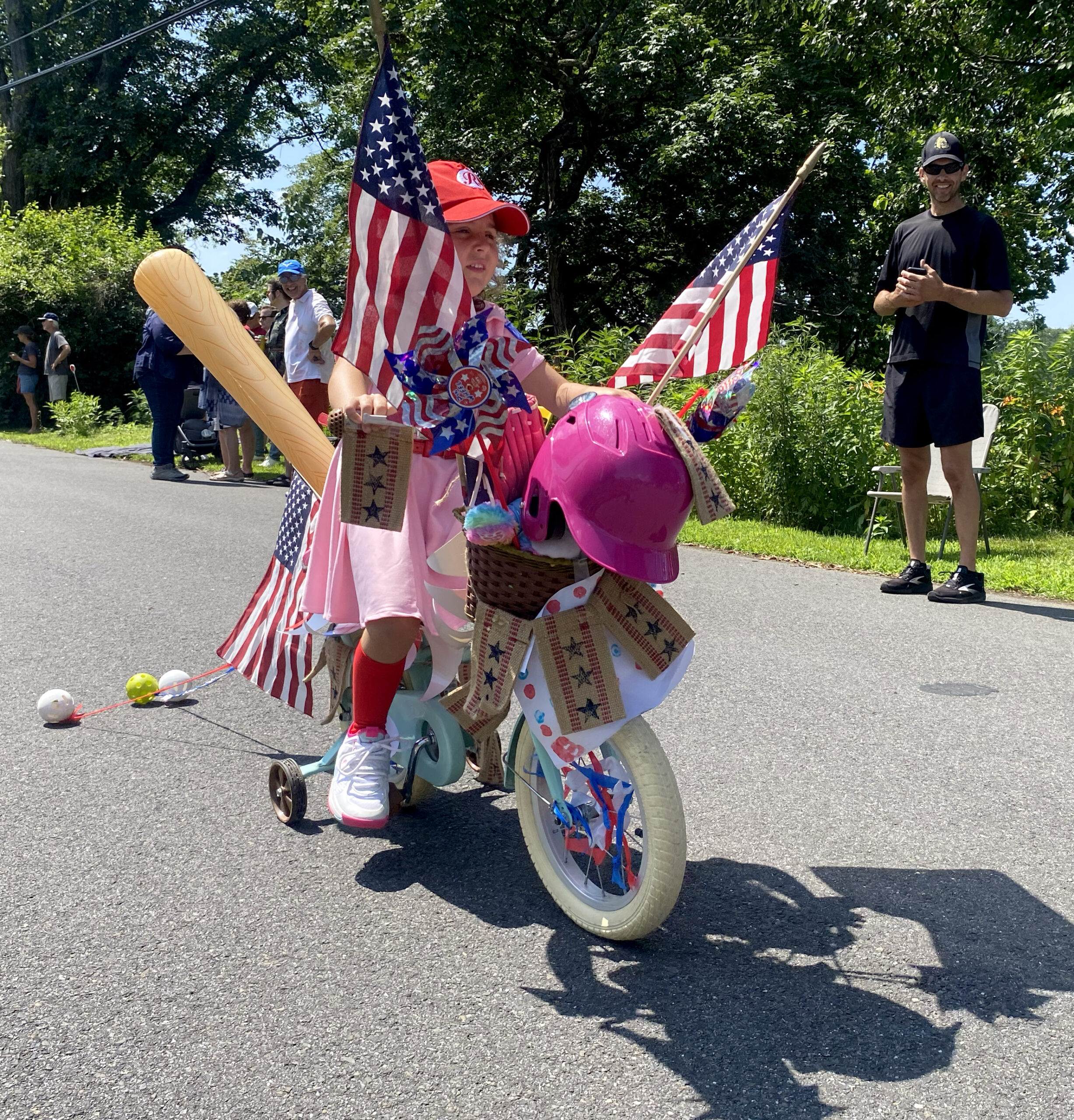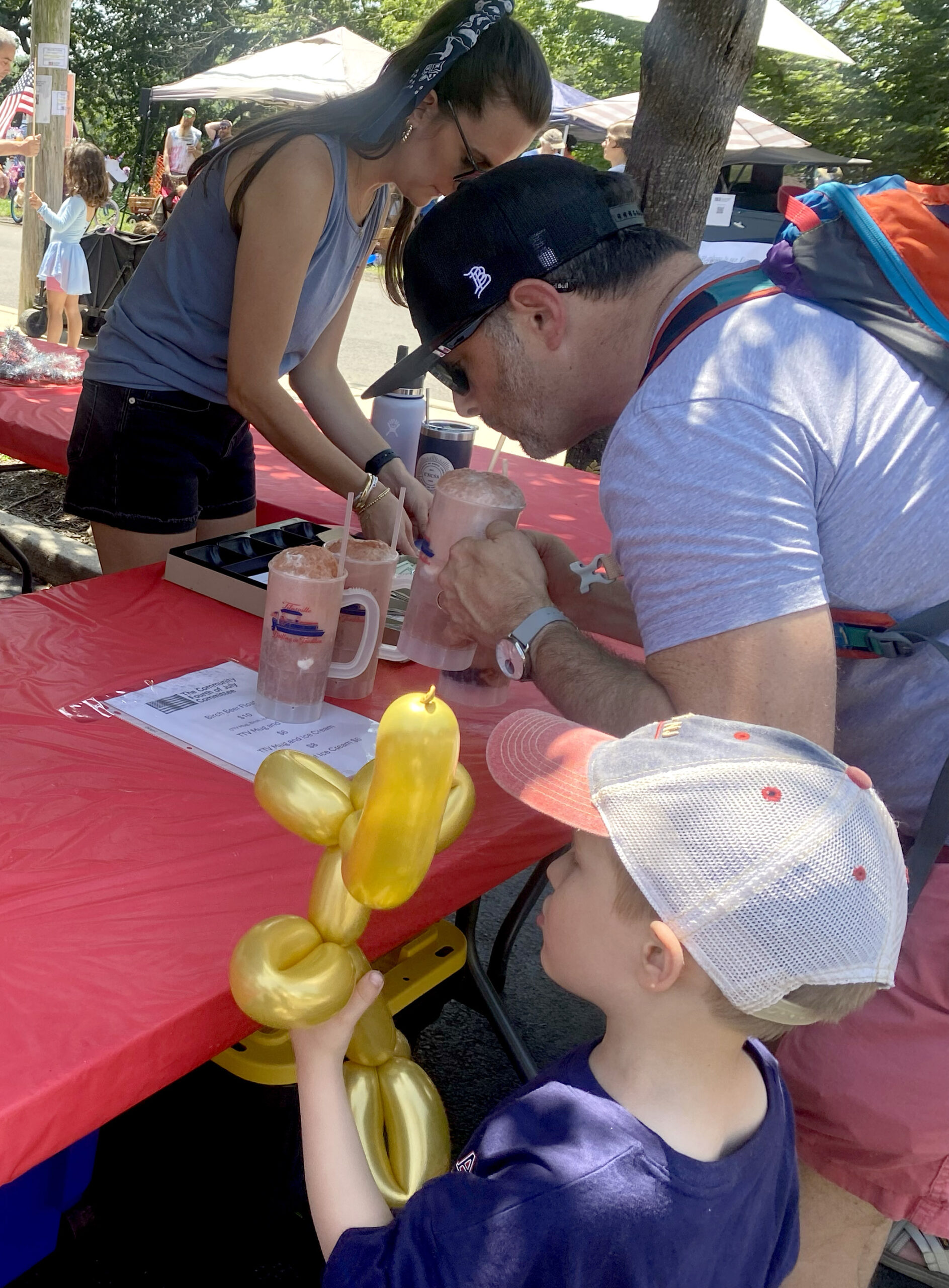 The River Dogs played lively tunes as faces were painted with rainbows and fireworks, balloons were sculpted into animals and hats, and red, white and blue streamers flew from bicycles. Spectators cooled off with birch beer ice cream floats from Uncle Ed’s Creamery, served in a food tent sponsored by the Prospect Heights Fire Department. Hamburgers, hot dogs, and pork roll were served all day.