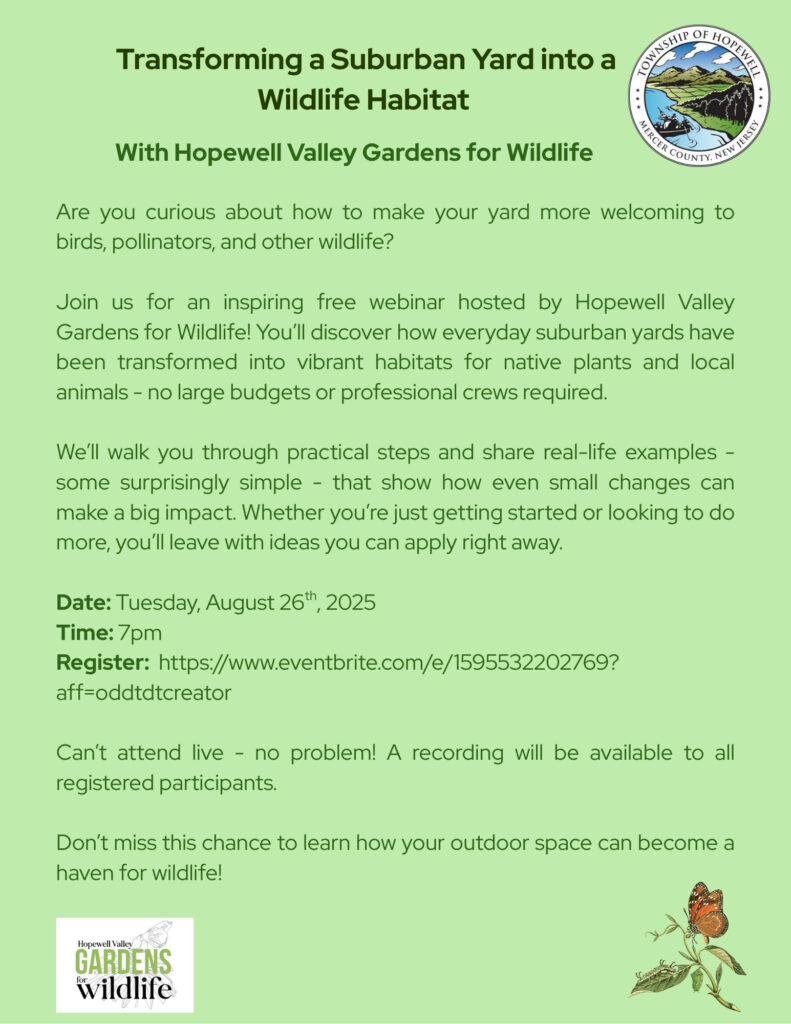 Join us for an inspiring free webinar hosted by Hopewell Valley Gardens for Wildlife! You’ll discover how everyday suburban yards have been transformed into vibrant habitats for native plants and local animals – no large budgets or professional crews required.