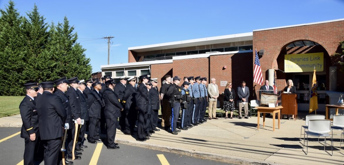 On the morning of September 11, a piece of steel that was recovered from the ruins of the World Trade Center was moved to the Hopewell Branch of the Mercer County Library on Pennington-Titusville. Following an outdoor ceremony, the steel was moved inside the library where it will be displayed for the next year.